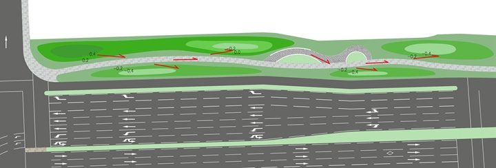 鳳凰路外側(cè)將人行道納入到綠地當(dāng)中,給行人以良好的林蔭環(huán)境,綠帶外側(cè)綠帶結(jié)合園路和場(chǎng)地進(jìn)行地形處理,外側(cè)多設(shè)置下凹式綠地和植草溝,收集地表雨水徑流,增加雨水下滲,部分路口節(jié)點(diǎn)綠地高于節(jié)點(diǎn)和道路,以豐富地形以形成良好的視線關(guān)系。