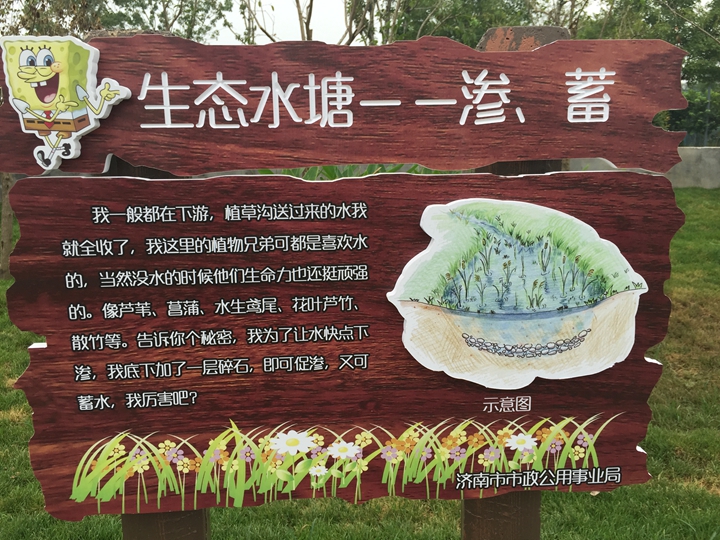 是濟(jì)南首條“海綿主題路”。道路共有三大綠地系統(tǒng),透水人行道、植草溝、生態(tài)水塘、齒狀沿石、溢流井、下沉式綠化帶、PP蓄水模塊和旱溪八種不同的部分構(gòu)成了完整的海綿系統(tǒng),分別起到滲、蓄、凈、排等作用。